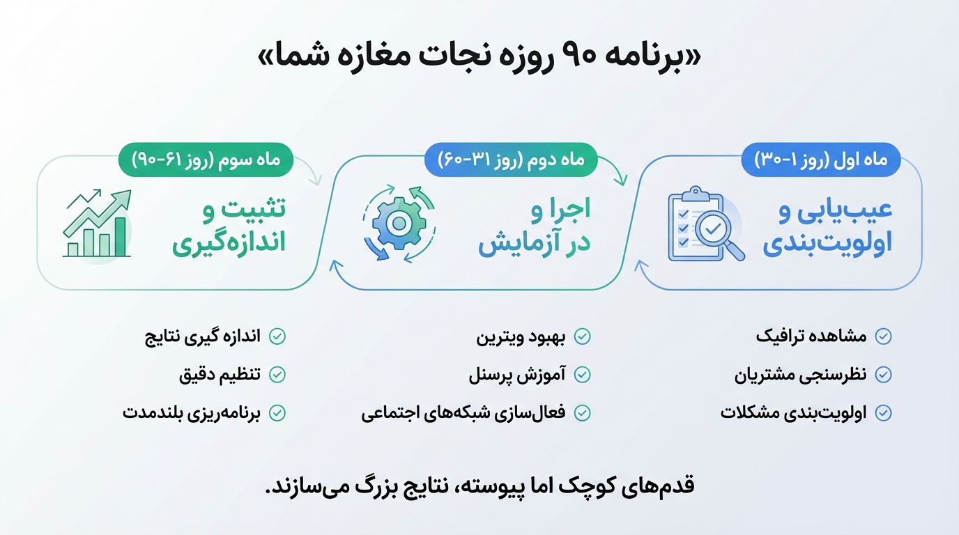 تغییرات کوچک اما مؤثر (مانند تمیز کردن ویترین، آموزش اولیه پرسنل، فعال کردن شبکههای اجتماعی) میتواند در ۲-۴ هفته نتایج اولیه را نشان دهد. اما برای تغییرات پایدار و اساسی، باید ۹۰ روز را به عنوان یک چارچوب واقعبینانه در نظر بگیرید. ماه اول برای عیبیابی، ماه دوم برای اجرا، و ماه سوم برای تثبیت و اندازهگیری نتایج.